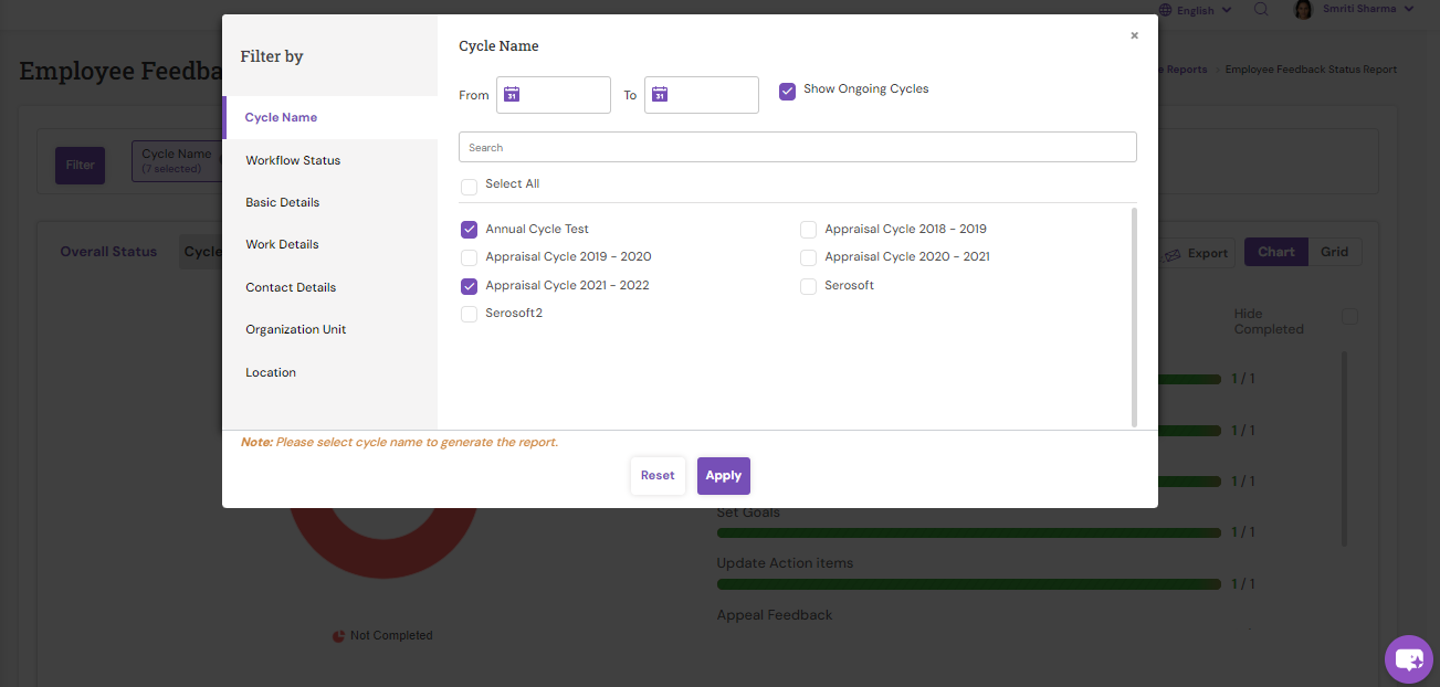 - Click Filter, uncheck Show Ongoing Cycles, and select the cycle(s) you want to view.