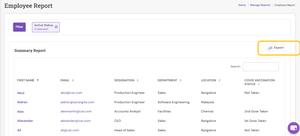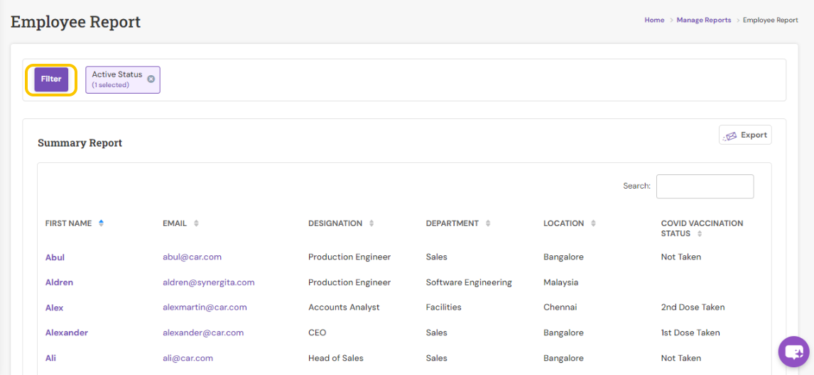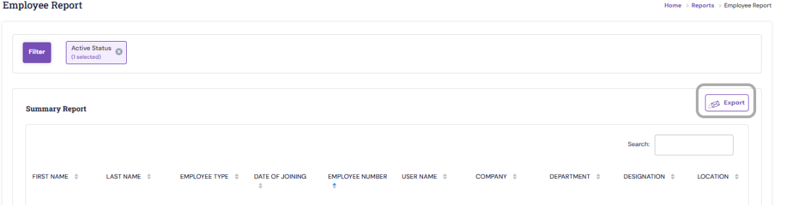 - Active status - Filters and generate report for all, active or inactive employees regardless of their status