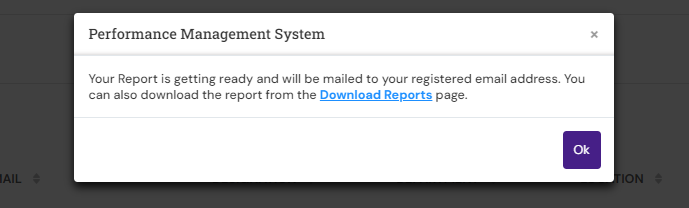 To export the report data, click the Export with mail sending icon. The system prompts to inform you that the report will be mailed to the registered email address and will be available Download Reports sections for download.