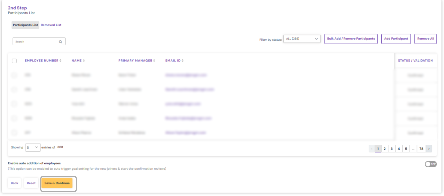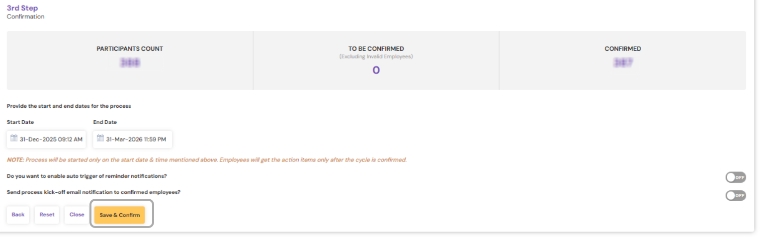 Note: The employees who are already added to an ongoing cycle cannot be included in the new cycle until their ongoing cycle is completed. |
