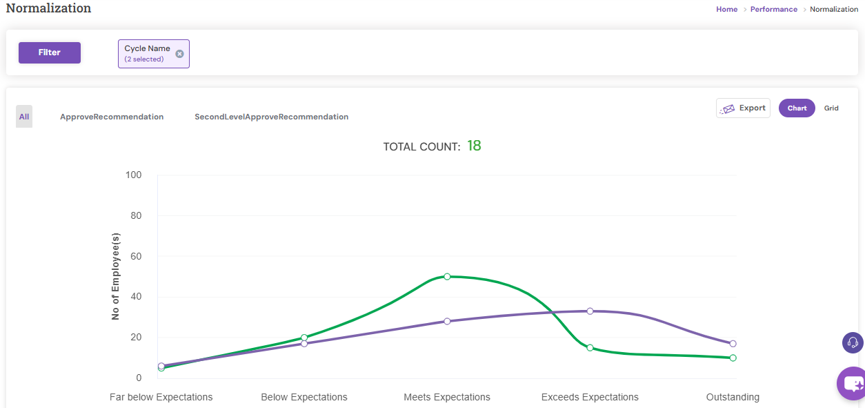 - On the Normalization page, managers/HR can verify whether the idealized bell curve set aligns with the actual bell curve, which is automatically generated based on the ratings provided.