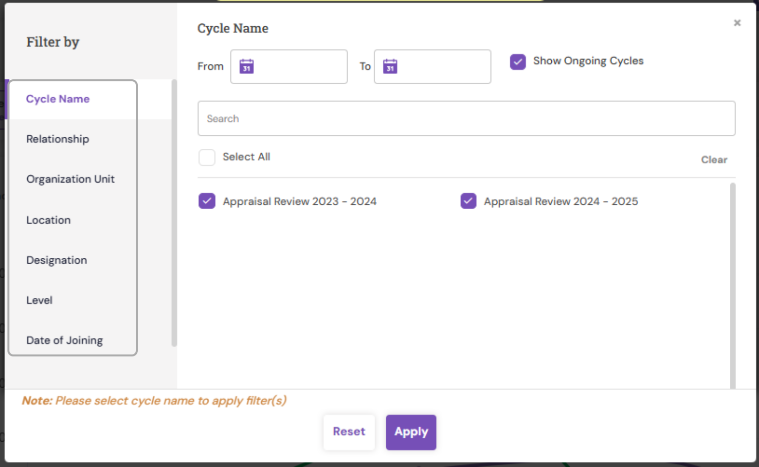 - The rating distribution across various parameters such as: Organization Units, Locations, Employee Levels can be analyzed using the filters.