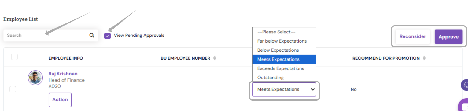 Reviewing the ratings, Approval, Rejection, or Modifying Grades before publishing the final results can be performed under the normalization page. To view the feedback details from the Normalization page;