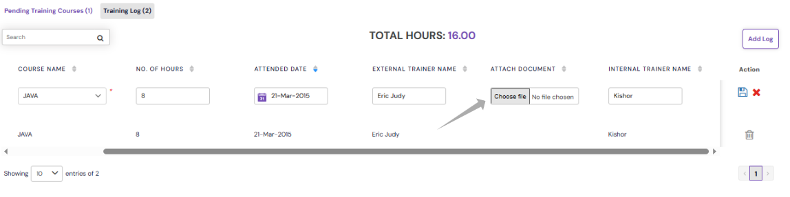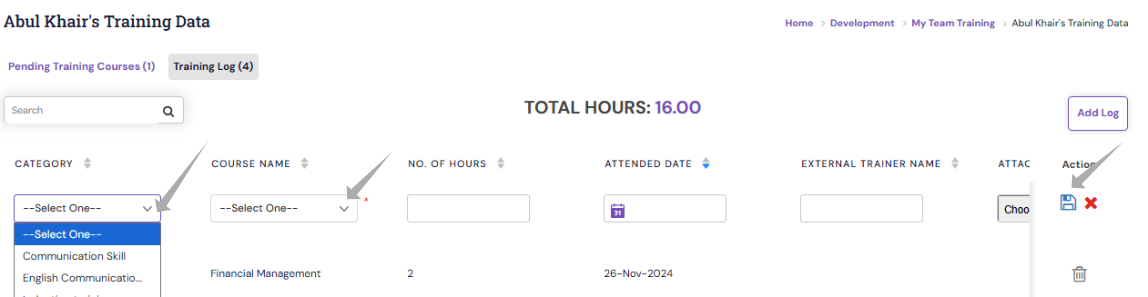 To add the training details,under the training log tab, Click on the ADD LOG button to add log on the training courses.