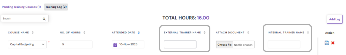 To add a trainer, enter the respective External or Internal Trainer Name in the designated column under the training course details.