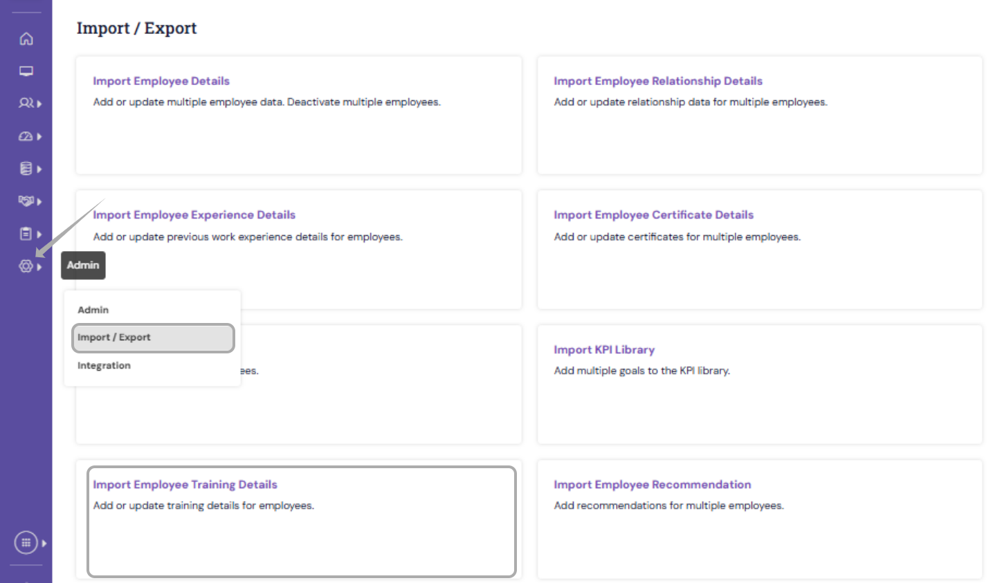 - Navigate to Admin > Import/Export and click Import Employee training Details.