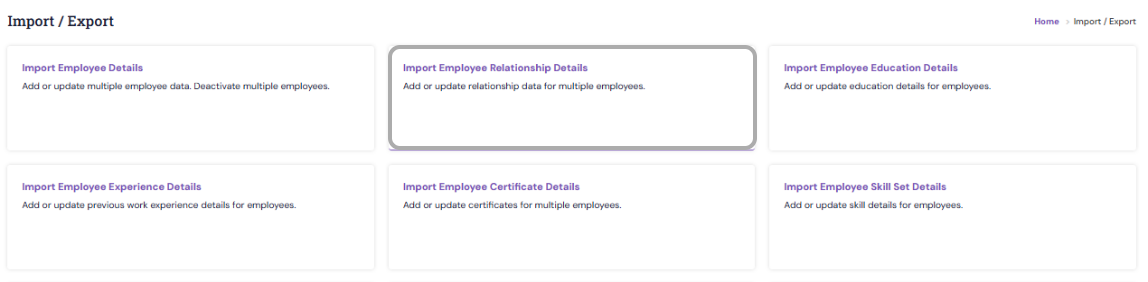 Navigate to Admin>> Import/Export, click Import Employee Relationship Details