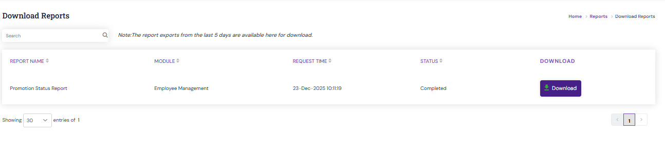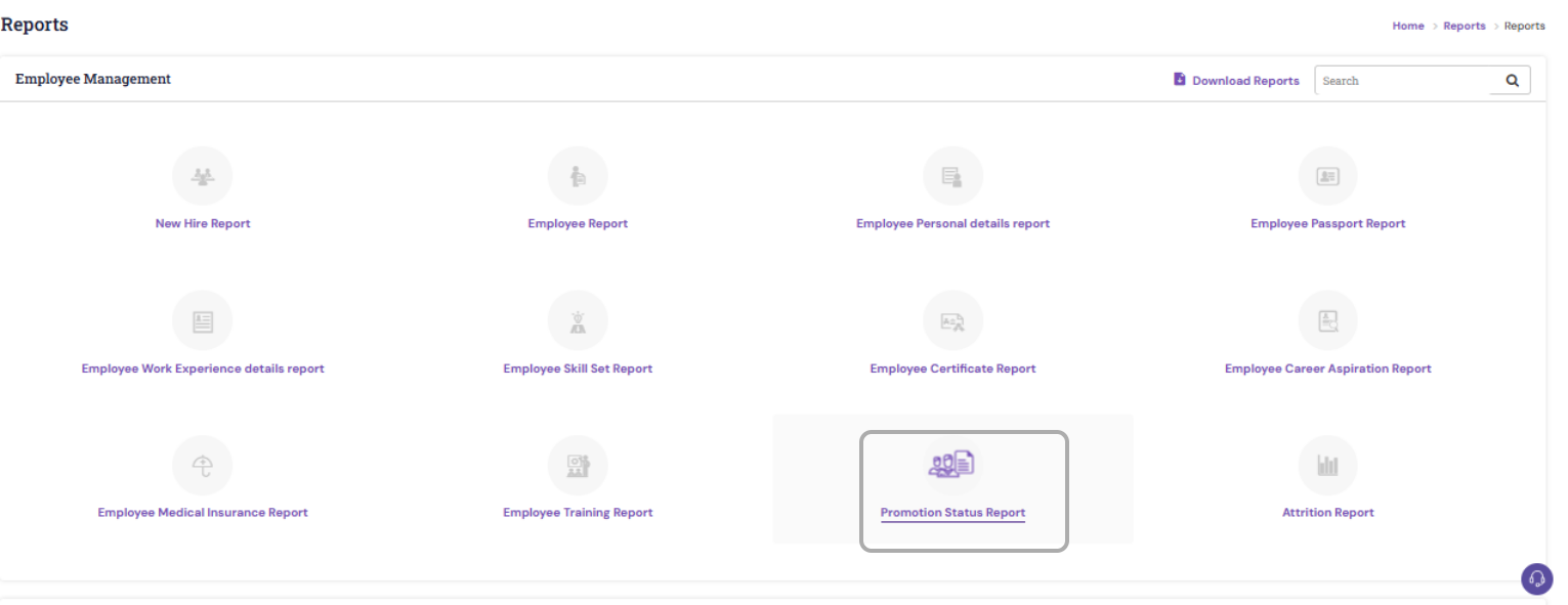 - In the default view, the Promotion Status Report page displays the grid with nomination history details respective to the employees.
