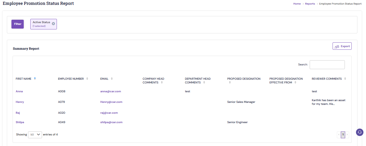 Promotion Status Report is an important report that helps HR to keep up-to-date with the promotion status of the nominees or employees. It summarizes the status of all the approval levels and publish status with respect to the employees during a particular time. This report displays in the grid form with the promotion status i.e., First Level Approval, Second Level Approval, Third Level Approval, Yet to Publish, Publish, etc., as configured in the system based on the business requirements.