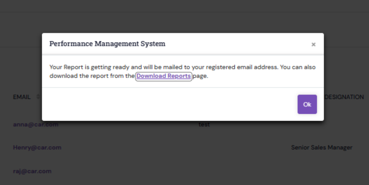 The system prompts to inform you that the report will be mailed to the registered email address and can also be viewed under the Download Reports link.