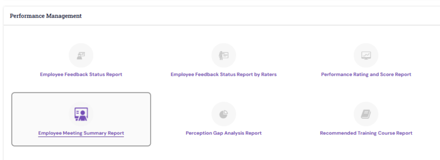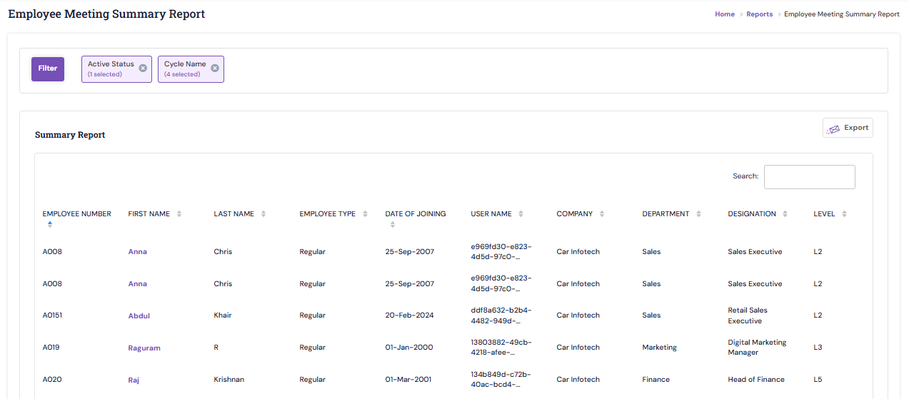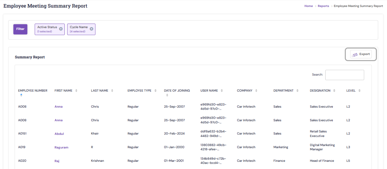 - The Employee Meeting Summary Report page displays the meeting summary details pertinent to the employees and their reporting managers for the ongoing cycles.
