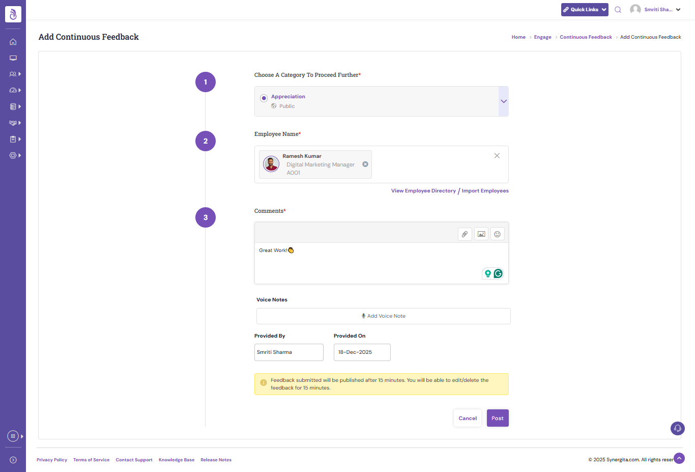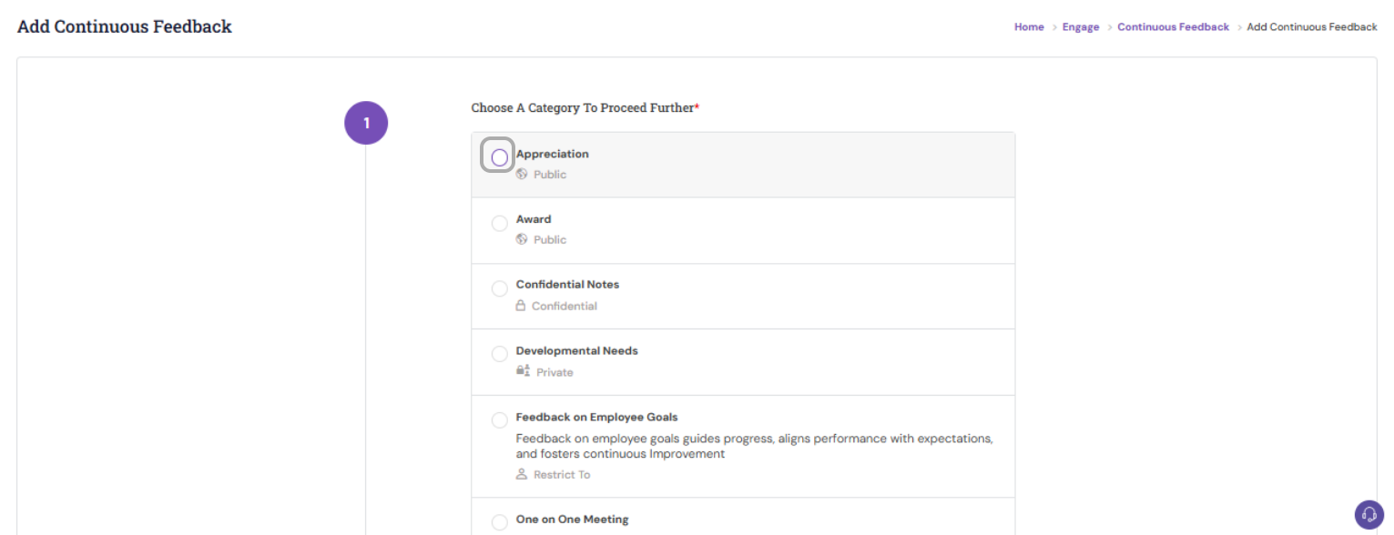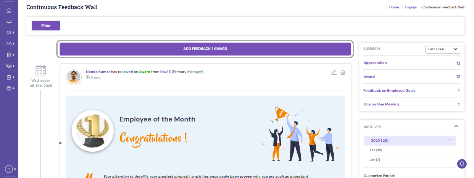 Continuous Feedback wall allows providing feedback under various categories and awards to employees. Who can provide feedback or awards to which employees depends on how your HR admin configured this module in the product.