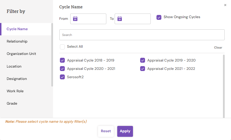 Cycle Name: Select a specific appraisal cycle to view the performance distribution for that period.