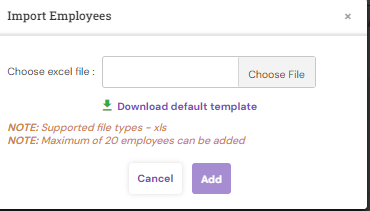 - Download the default template, add the required employees to whom the feedback is to be provided, save the Excel form, click the "Choose file" option and upload the employees by clicking Add