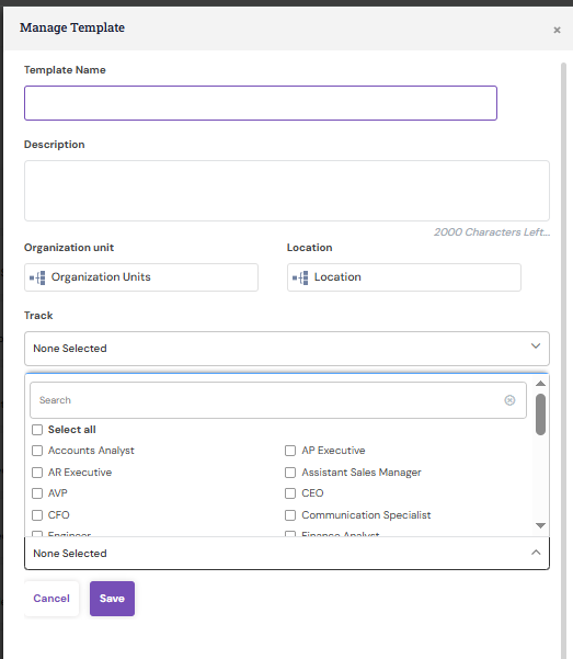 Provide the Template Name and Description, and from the available options—such as Department, Designation, Location, Level, or Work Role—select the relevant mapping criteria as per the mapping logic.