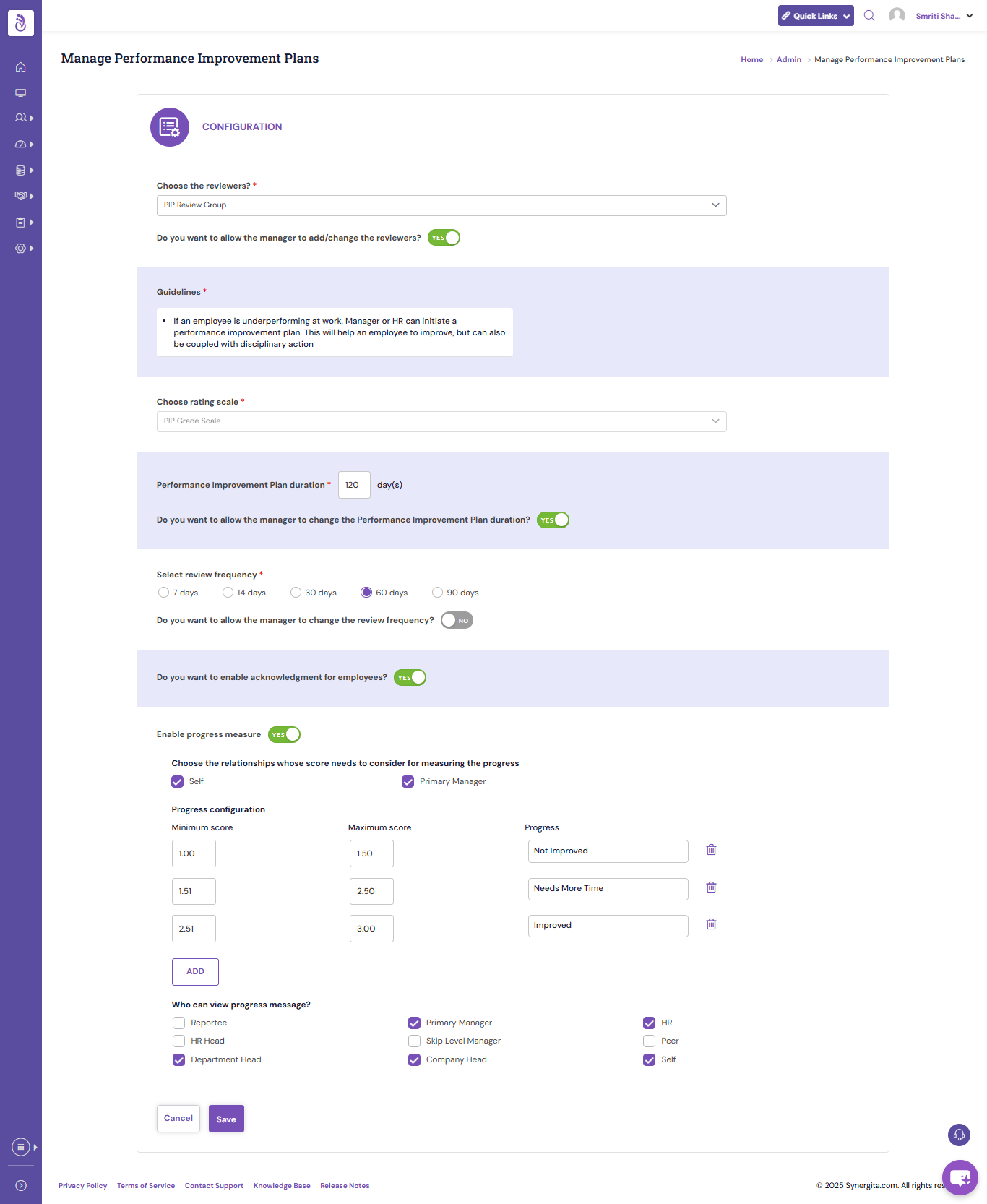 - Enable Progress Measure to generate progress buckets based on minimum and maximum scores received during the PIP.