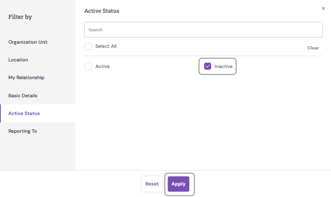 - Filter deactivated employees by selecting Active Status as Inactive from the filter options and click Apply.