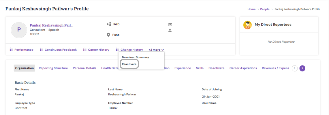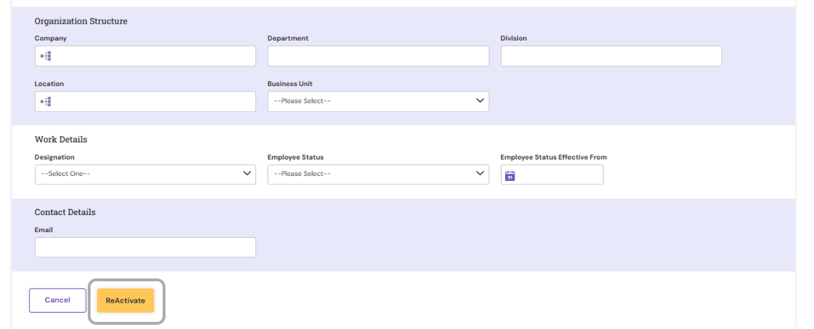As an HR Manager, you can reactivate employees who were previously relieved from the organization. Reactivating an employee restores their access and allows you to update their profile with new joining details.