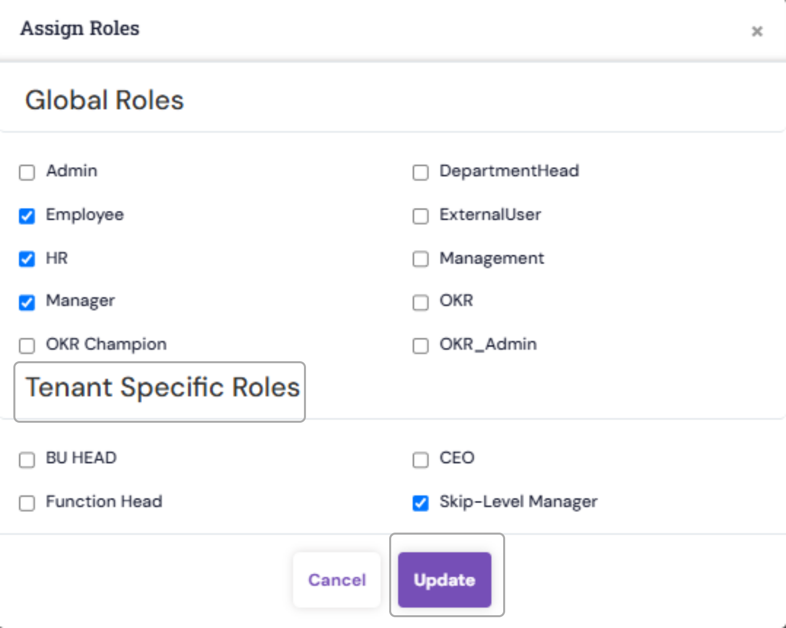 Click Update to apply the role mapping.Once the roles are selected for the employee,