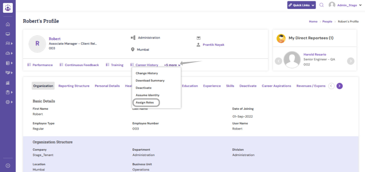 Select the appropriate role from the available list (e.g. Manager, HR Admin, Business Head). The roles are into 2 categories- Global Roles and Tenant specific roles.