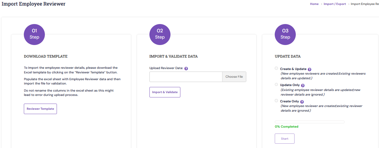 Update Only – Existing employee reviewer details are updated; new reviewer details are ignored.