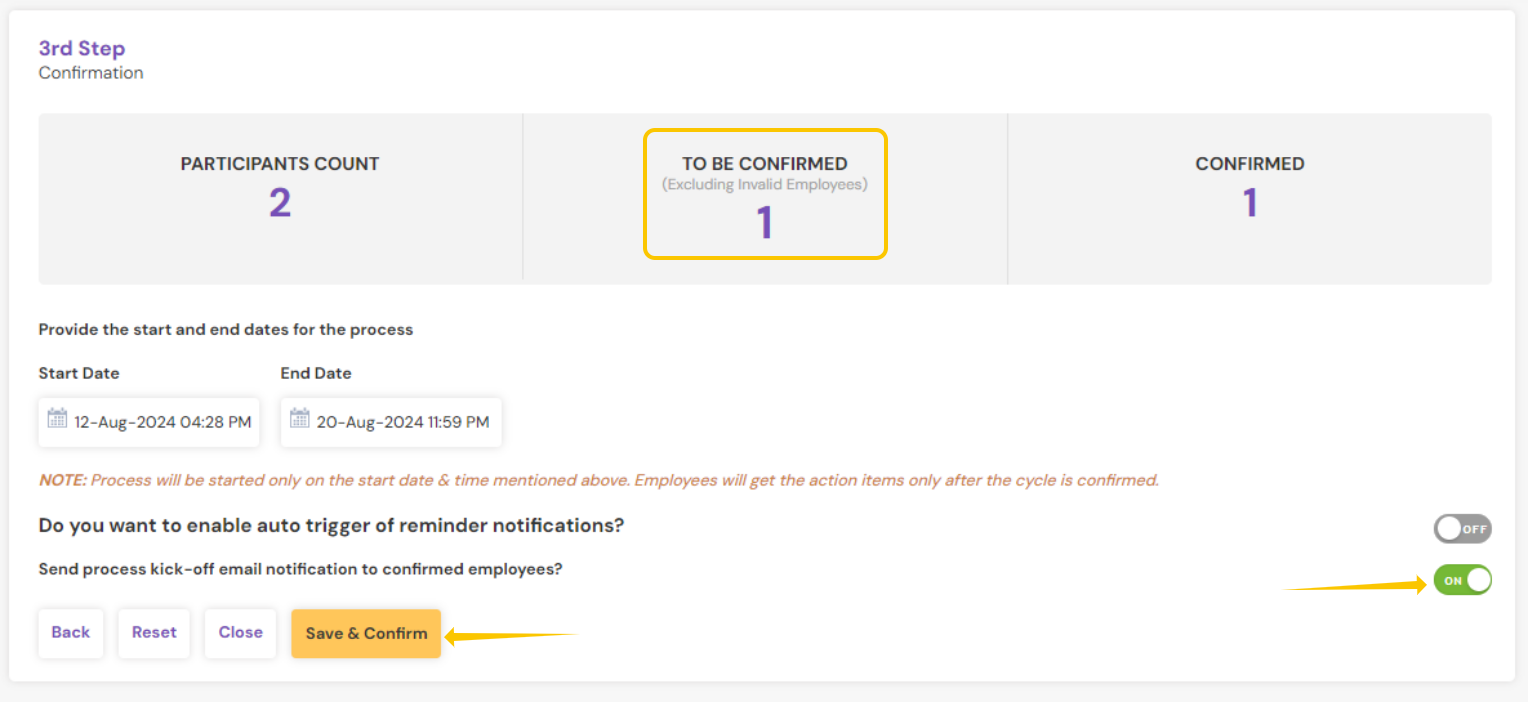 6. Enable the Send process kick-off email notification to confirmed employees button first and click on the Save & Confirm to send the kick-off email only for the employees in the "TO BE CONFIRMED" state.