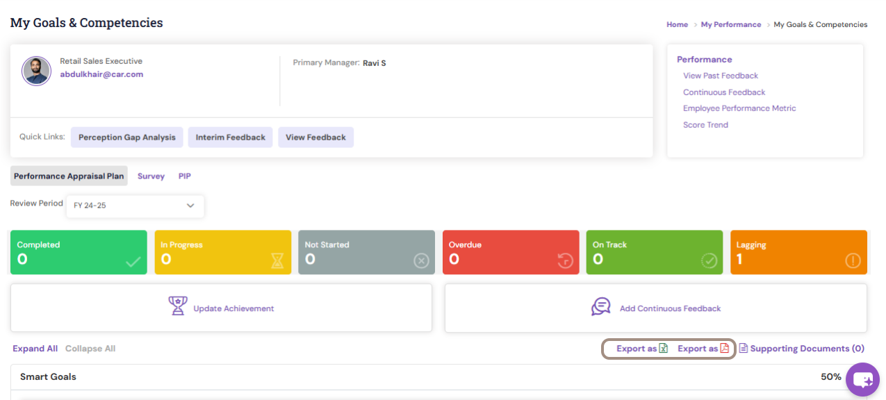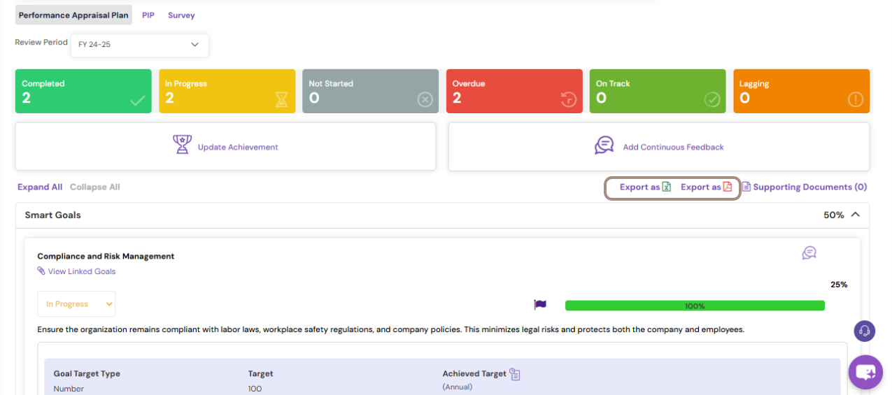- To download your goals, use the Export as Excel or Export as PDF options.