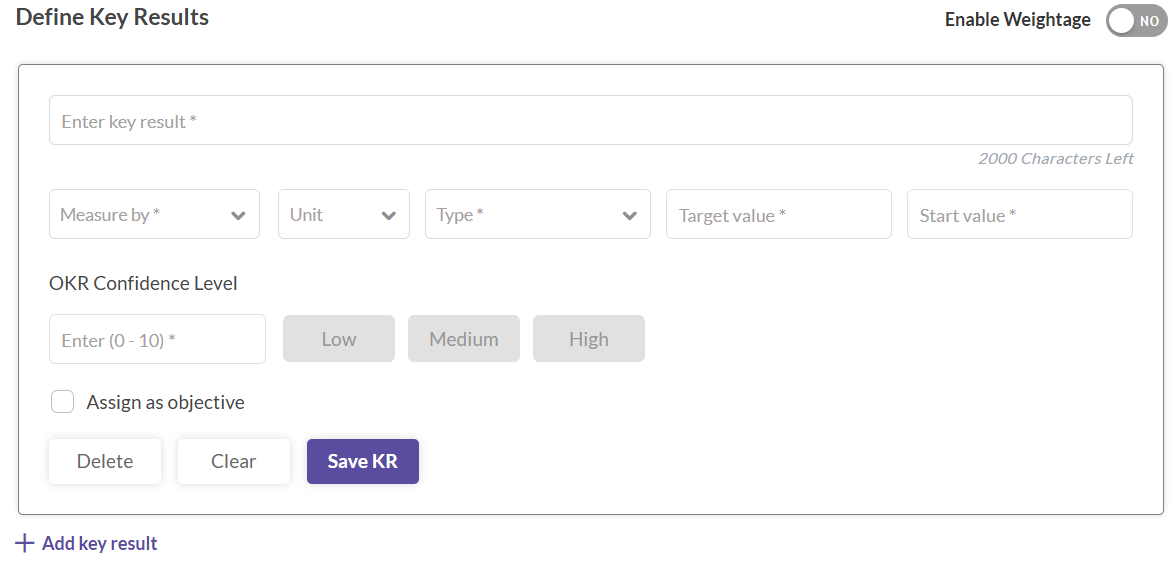 Weightages (Optional): Assign weightage to each key result to define their varied contribution to achieving the objective. Click the "Enable Weightage" toggle button to enable this feature. Ensure the total weightage of all Key Results equals 100%.