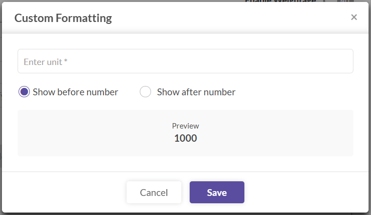 Unit: Select a unit of measurement. Options include "#", "%", "$", "R", "₹", "£". If these don't suit, choose "Custom". This opens a popup where you can input a unique symbol or text. You can then determine its placement relative to numbers, using the "Show before number" or "Show after number" radio buttons.