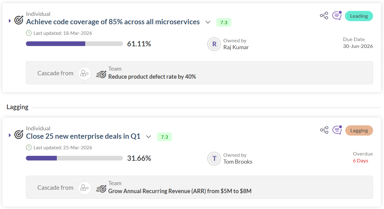 - On-track indicators reassure that the efforts are in line with the target, and the objective is progressing as planned.