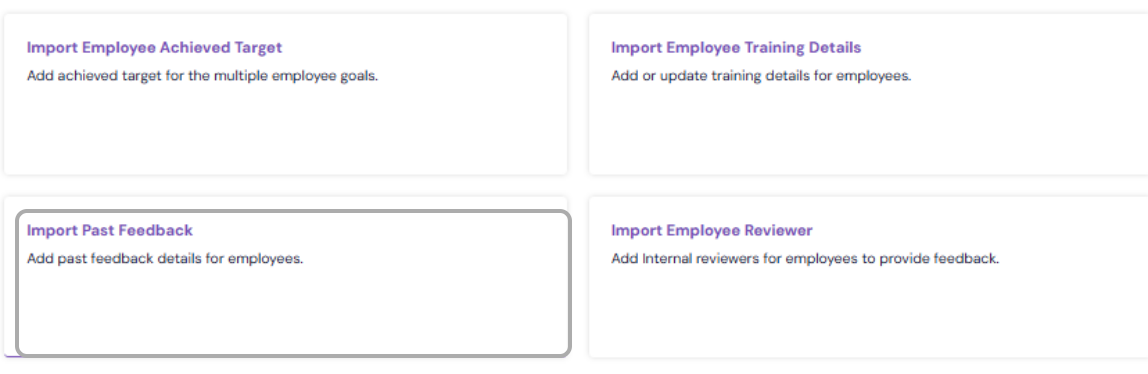The Import Past Feedback feature allows HR administrators to upload historical feedback data for employees into the system. This helps maintain a complete performance history by consolidating feedback from previous review cycles or external sources, ensuring that all relevant information is available for reference during future performance evaluations.