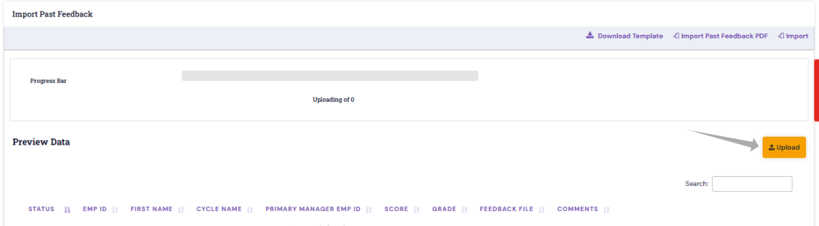 The imported details will be available for preview before uploading.Review the data carefully, and once verified, click Upload to complete the process.Upon completion, the system will show a success message indicating that the past feedback data has been uploaded successfully.