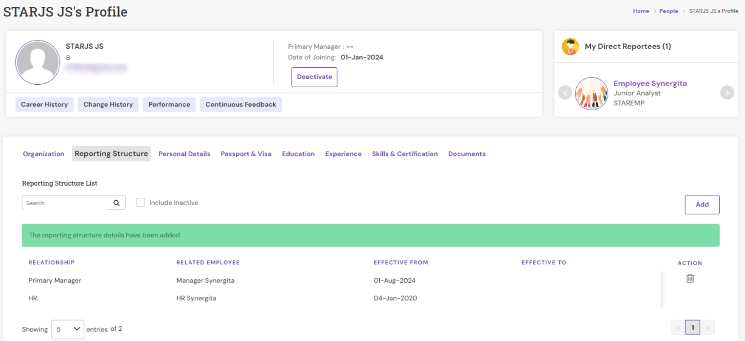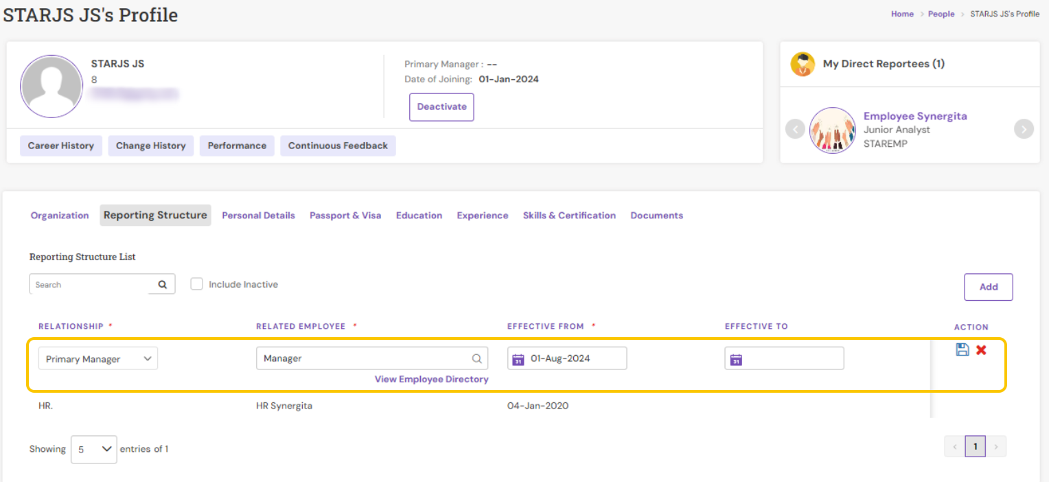 Maintaining accurate reporting relationships is essential for smooth workflow and performance management. In Synergita, HR administrators and managers can assign a Primary Manager to an employee, ensuring clarity in reporting structures and approvals.