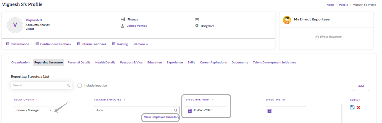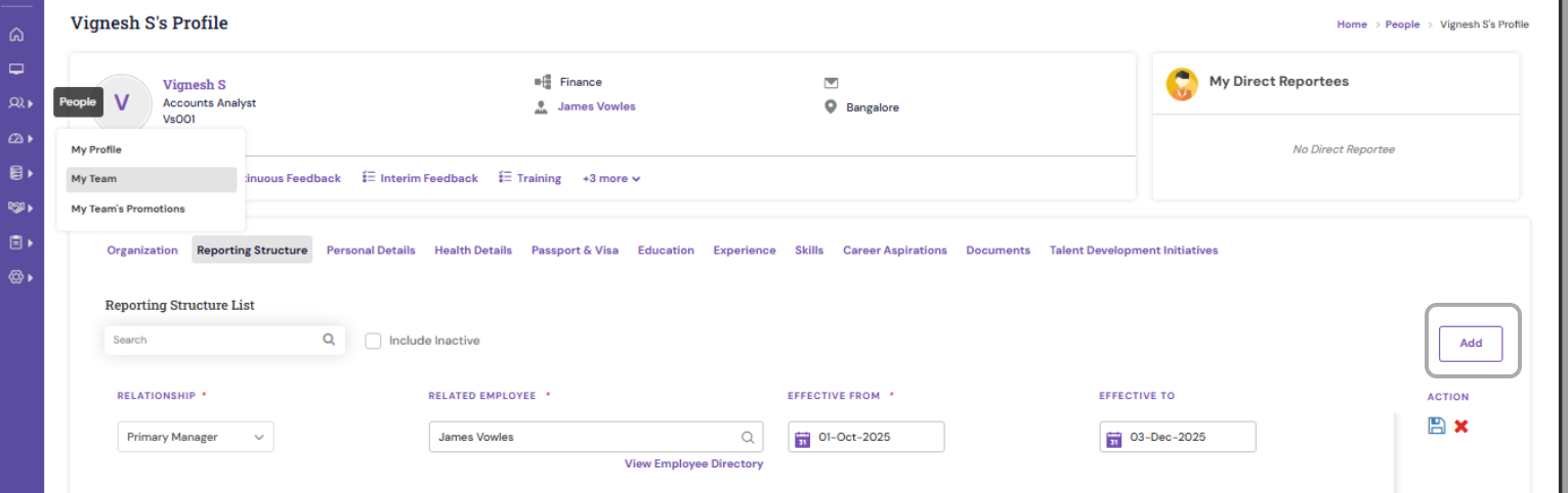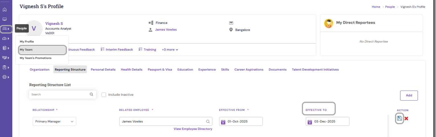 - Navigate to People> My Team > Employee profile > Reporting structure tab.