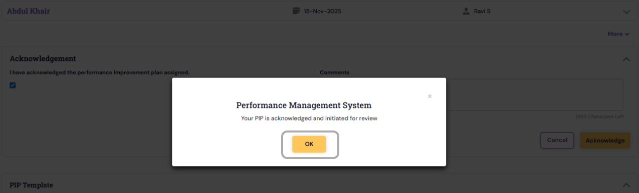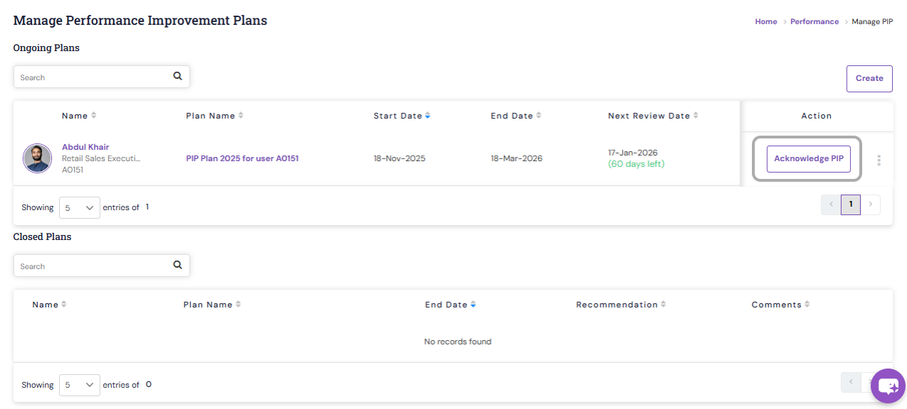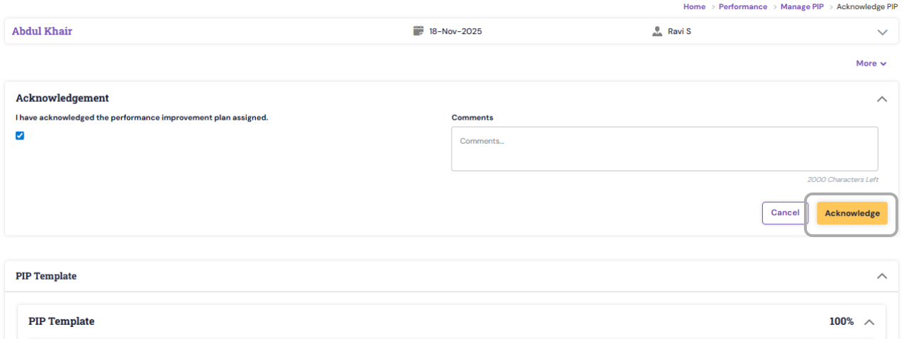 - The employee can go to Performance → Manage PIP, view the assigned PIP, and provide the PIP acknowledgment to confirm that they have reviewed the plan details.