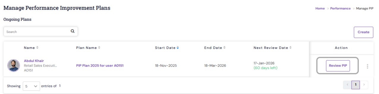 - The employee can then proceed to Review PIP, where they can provide ratings and comments for the goals assigned to them.