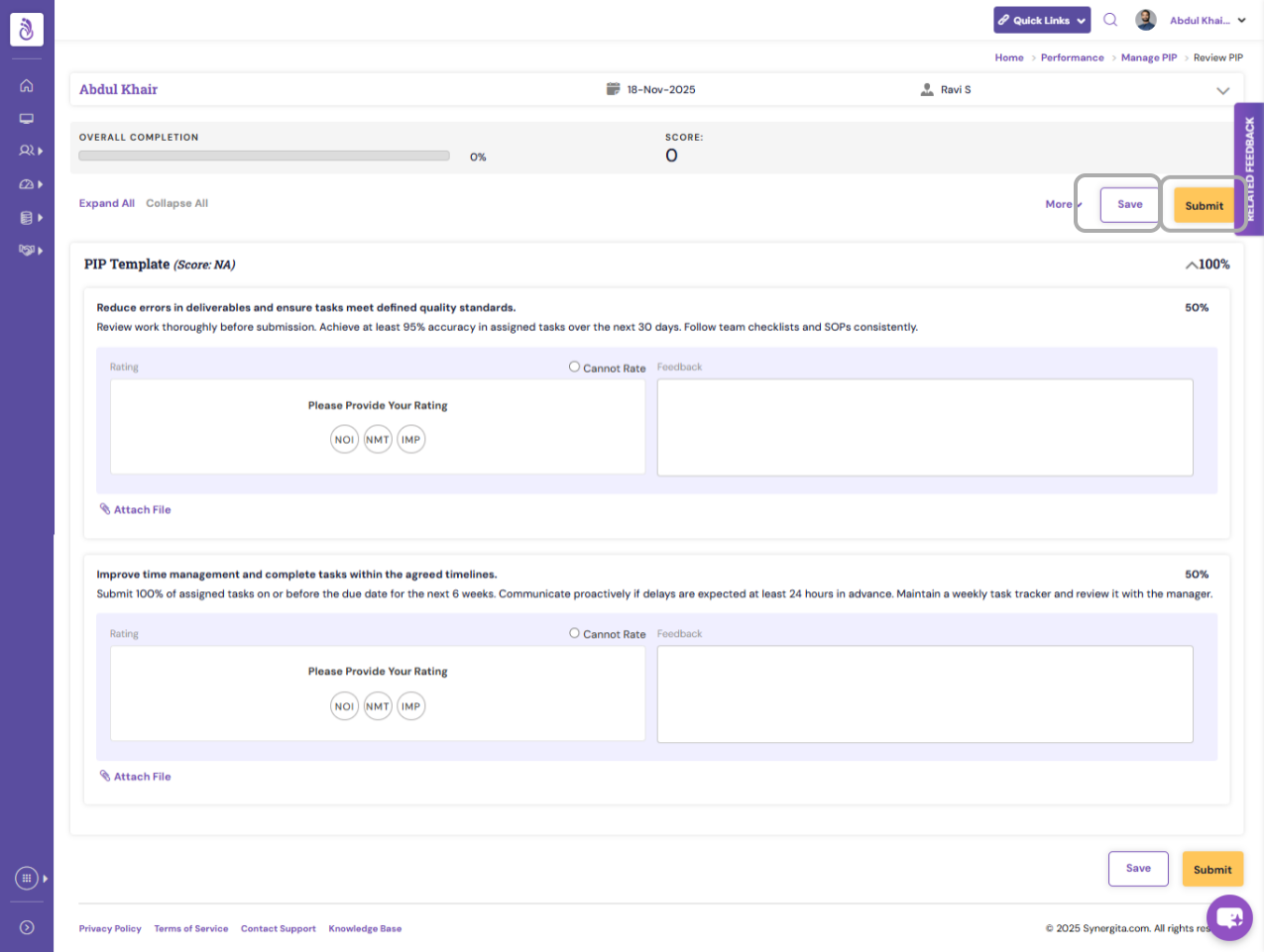- Click Save to store your feedback and Submit to finalize and complete the submission.