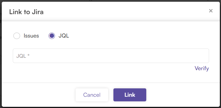 - A pop-up titled “Link to Jira” will appear, offering two methods to link: Issues and JQL.
