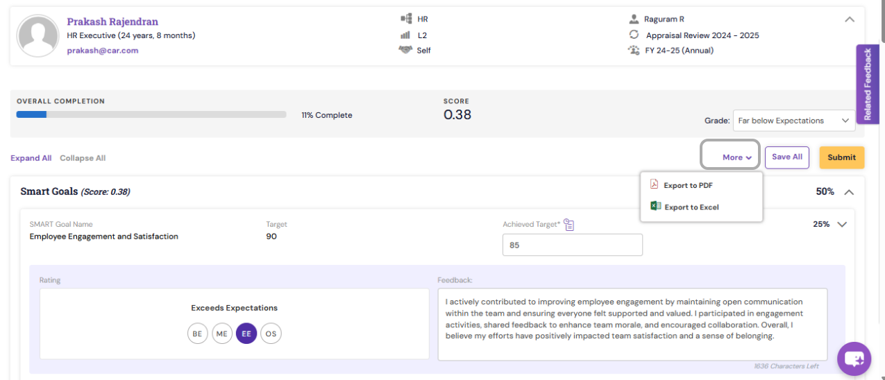 Note - You can export a copy of your self-feedback for your reference before submission. Click the Export as under More option to save a copy of your filled feedback form. |