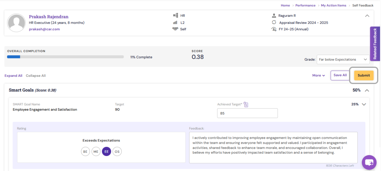5. Once you have completed all sections, click Submit to send your feedback for your manager’s review.
