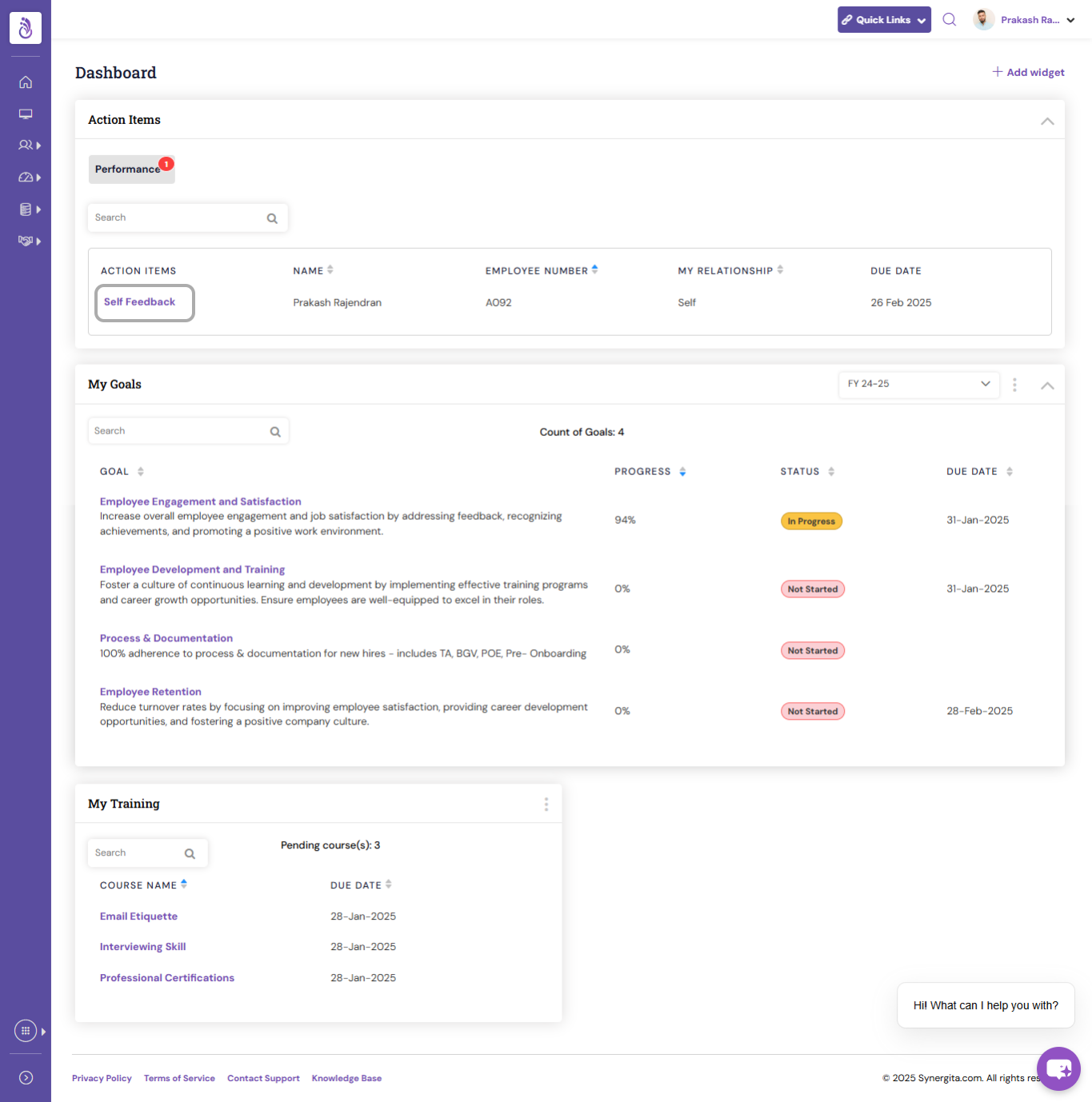 The Self Feedback feature in Synergita PMS allows employees to evaluate their own performance for the review period. This helps you reflect on your achievements, note areas for improvement, and share your perspective before your manager provides feedback.