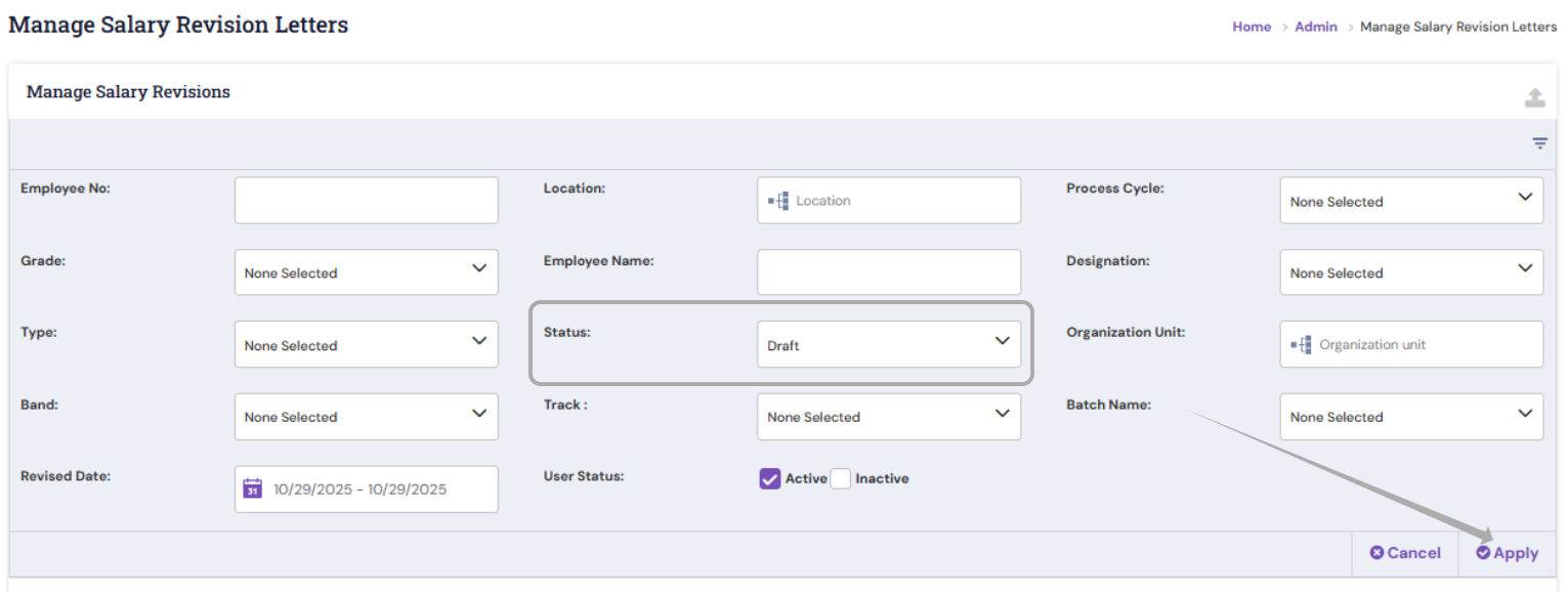 - HR can apply the filters to download the Revision Letter of the required employees. They can apply the "Draft" Status filter to view the uploaded details. Once the required filters are chosen, click Apply.