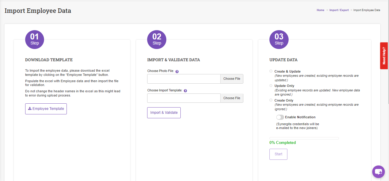 The upload progress and completion percentage will be displayed on the screen.The system will process the data accordingly and update the employee in the PMS.