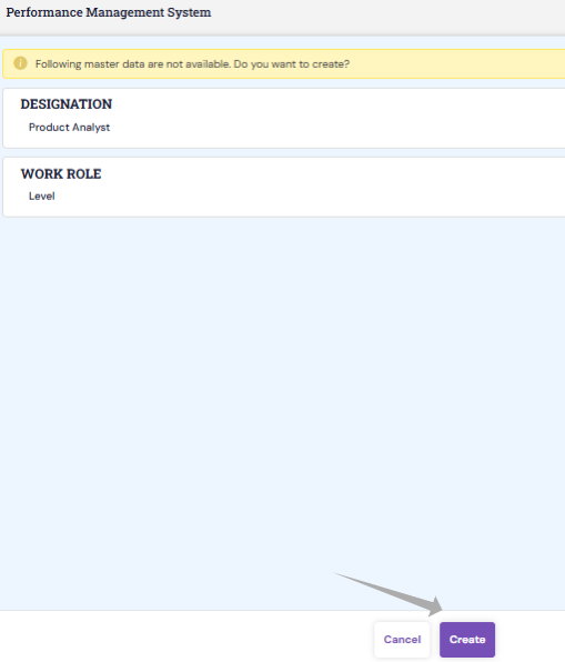 Note: If the selected designation or work role is not available in the PMS, a pop-up message will appear stating that the data is not available in the master list and will prompt you to create a new designation/work role.