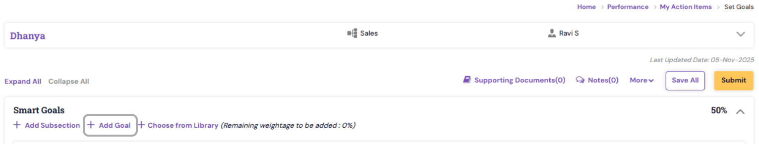 This article will guide you through the steps to add a new goal in the system, ensuring that goals are structured, aligned, and ready for evaluation during performance cycles.