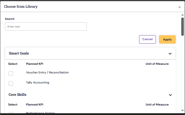 The configured goals in the Library will be displayed for you to choose. You can search or click on the check box of the respective goals and then click on Add to the goal button.