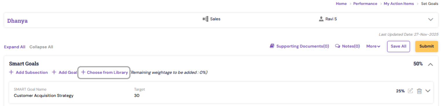 The Manager/Employee defining the goals can access teh library under the navigation given below: