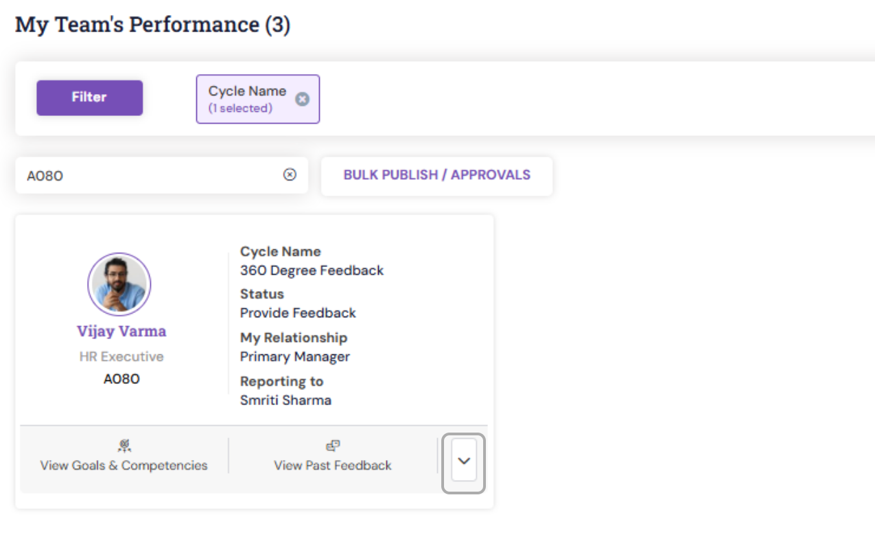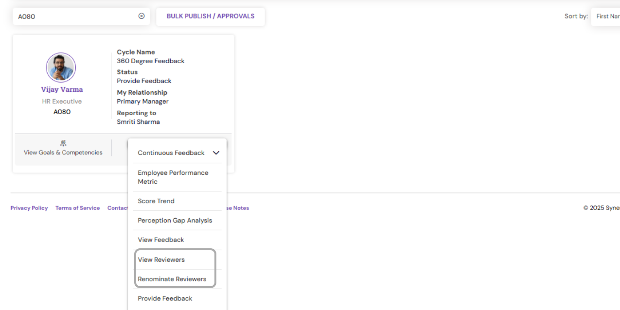 - Alternatively, navigate to Performance > My Team’s Performance, search for the specific employee, and click the down arrow to view the Renominate Reviewer or View reviewers section. This screen displays the list of nominated raters and their current status within the process.