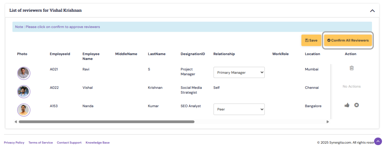 - If the manager is satisfied with the nominated raters, they can Confirm All Reviewers.