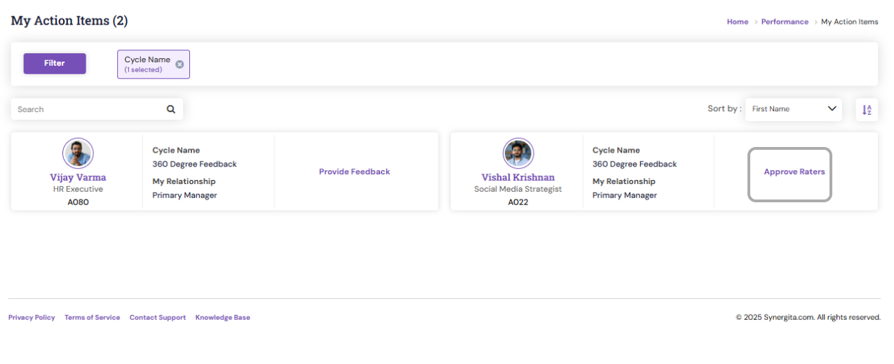 When the 360° review cycle is initiated and reviewer nomination is part of the process, managers are required to review and approve the raters nominated by the employee. This ensures that the selected reviewers are appropriate, relevant, and capable of providing meaningful feedback.